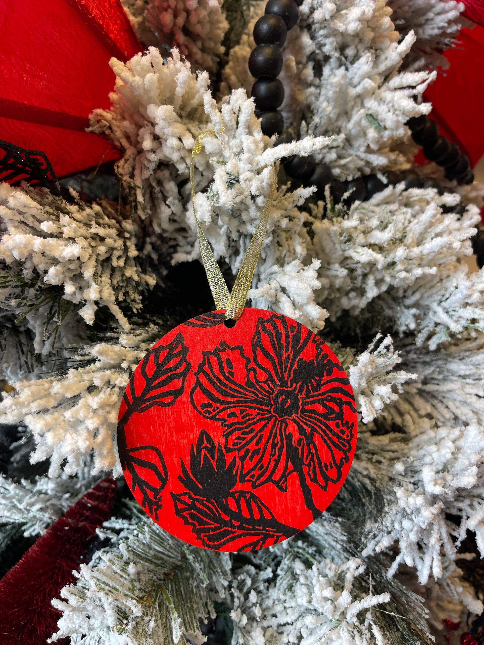 Handmade custom linocut print printed on wood ornaments with black ink with silk ribbon.