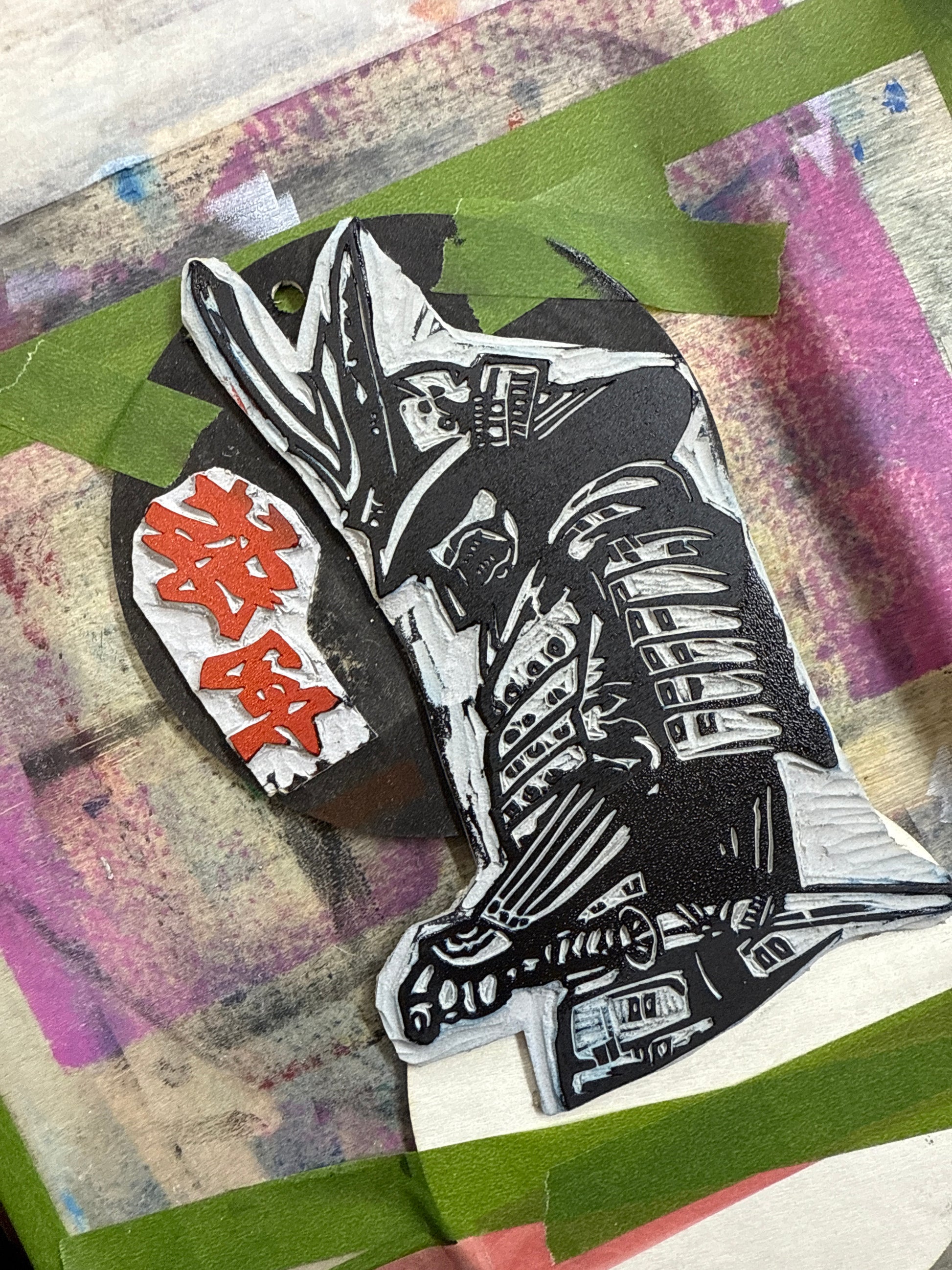 Handmade custom linocut printed on wood ornaments with rubine red, black, & gold ink. The outside edges of the ornament is hand painted with gold paint & will come with a gold ribbon. Every ornament is also sealed.