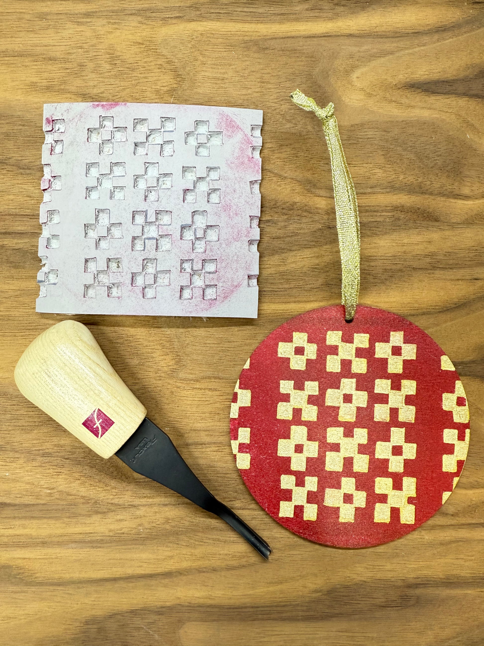 Handmade custom linocut print printed on wood ornaments with rubine red ink. The design and outside ddfe of the ornament is hand painted with gold paint. Every ornament is also sealed.