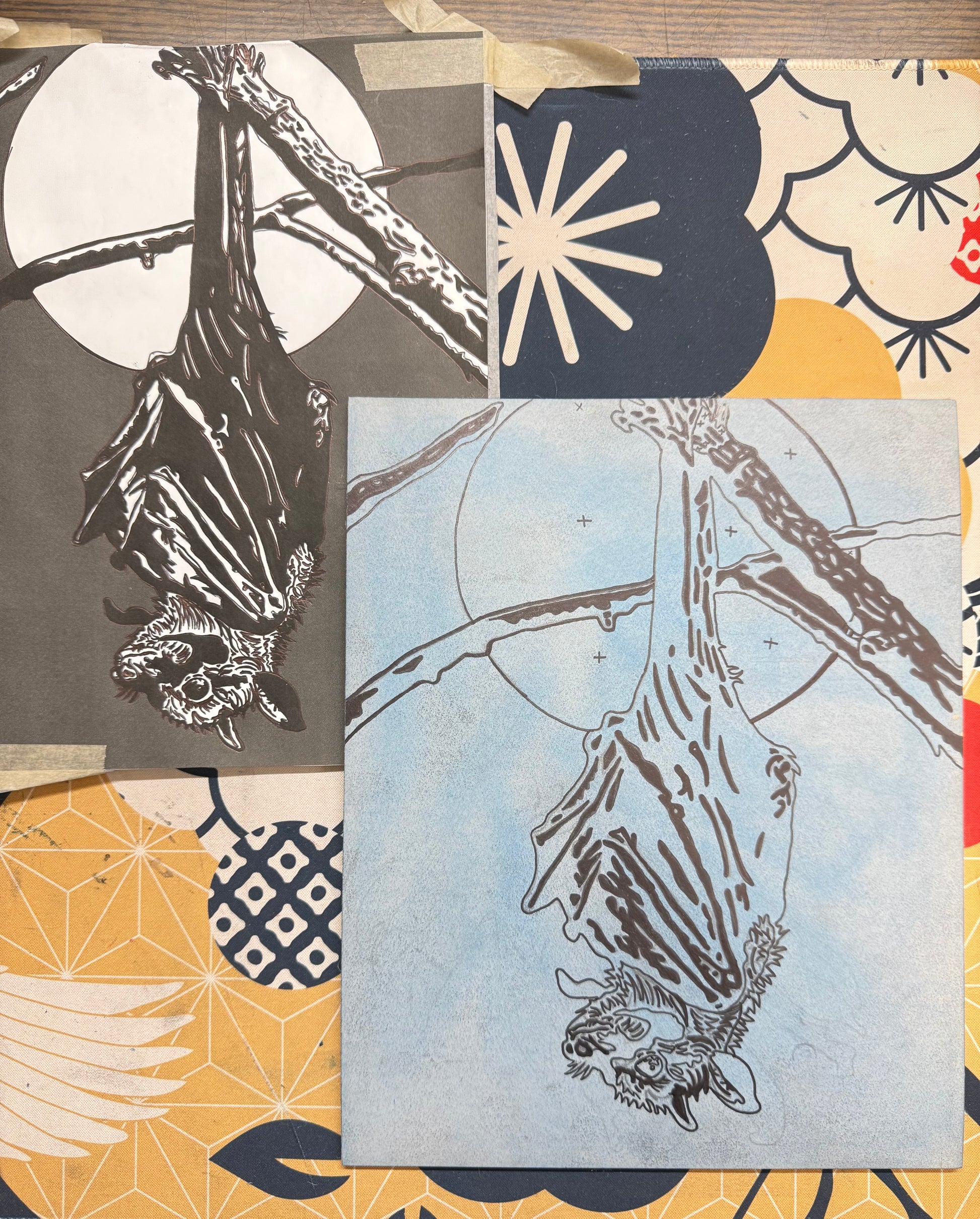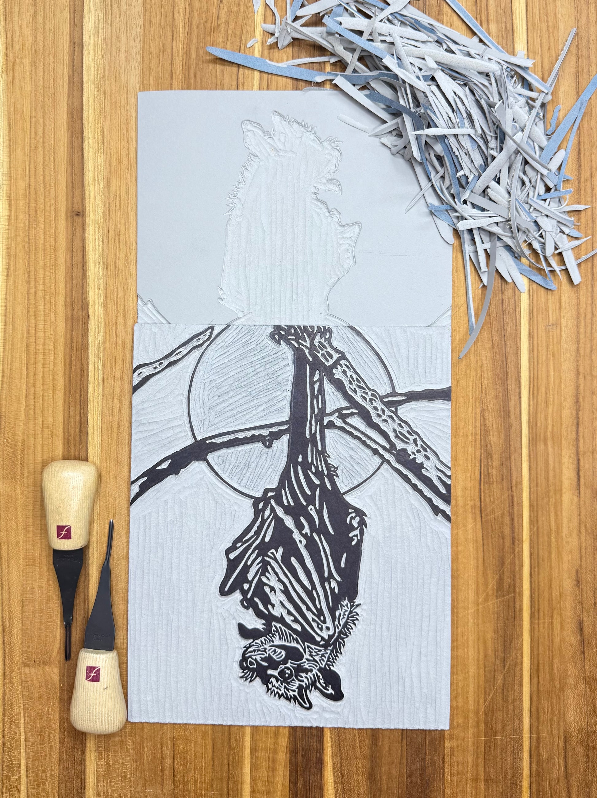 Linocut is a relief technique in printmaking where carving tools are used to remove areas of the linoleum to create the design. After carving, I use professional printmaking ink to roll over the design. The areas that get inked are the sections that were not carved away. For the last step I use handmade paper and press the design which transfers it onto the paper.